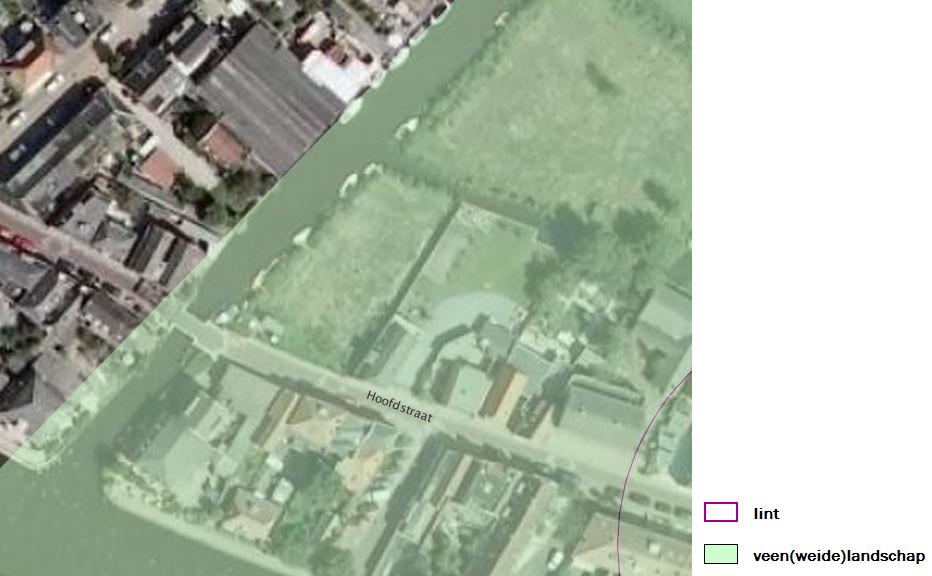 Het plangebied ligt in de lintbebouwing van het veen(weide)landschap. De structuur in de veengebied is sterk bepaald door de rivieren en veenstromen, de op enige afstand daarvan aangelegde weteringen en andere ontginningsbasissen. Loodrecht daarop staan de (regelmatige) verkavelingspatronen. Het landschap is tussen deze structuren weids met lange zichtlijnen. Andere kenmerken zijn de smalle kavels, vele sloten met hoog waterpeil en overwegend grasland als bodemgebruik. Belangrijke kenmerken van het veenweidegebied zijn het contrast tussen (meer verdichte) hooggelegen boezems, linten en bovenlanden en het uitgestrekte, ingeklonken veen (open gebied). Veenstromen, dijken en kades vormen landschappelijke structuurdragers en begrenzen de (open) poldereenheden. Met betrekking tot nieuwe bebouwing in het veenweidegebied is het richtpunt dat deze worden geplaatst binnen de bestaande structuren/linten en niet in de veenweidepolders. Omdat het plangebied in het stedelijke gebied ligt (zie ook de volgende afbeelding 'Laag van de stedelijke occupatie) wordt aan dit richtpunt voldaan.
